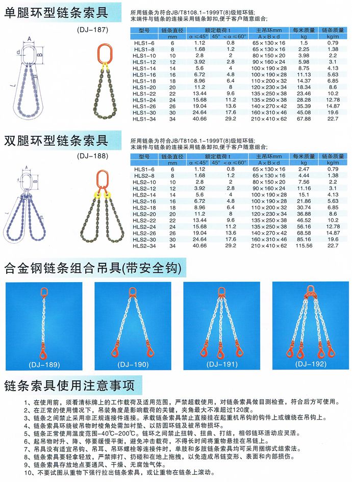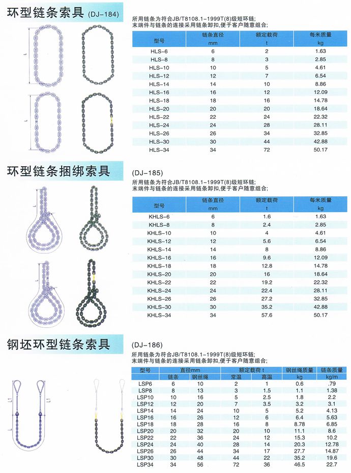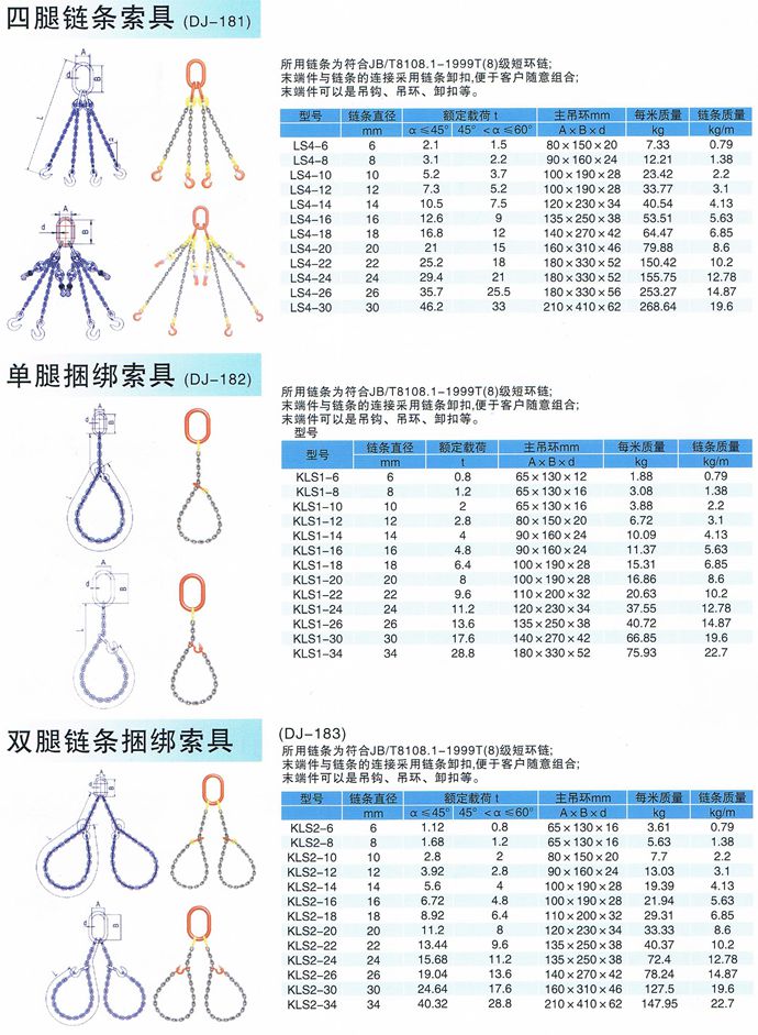 鏈條索具有:單肢鏈條索具、單肢鏈條捆綁索具、單肢環(huán)形鏈條索具、雙肢鏈條索具、雙肢鏈條捆綁索具、雙肢環(huán)形鏈條索具、三肢鏈條索具、四肢鏈條索具、環(huán)形鏈條索具、環(huán)形捆綁鏈條索具、高強度吊裝鏈條、鋼坯專用鏈條索具、可調(diào)鏈條索具等。