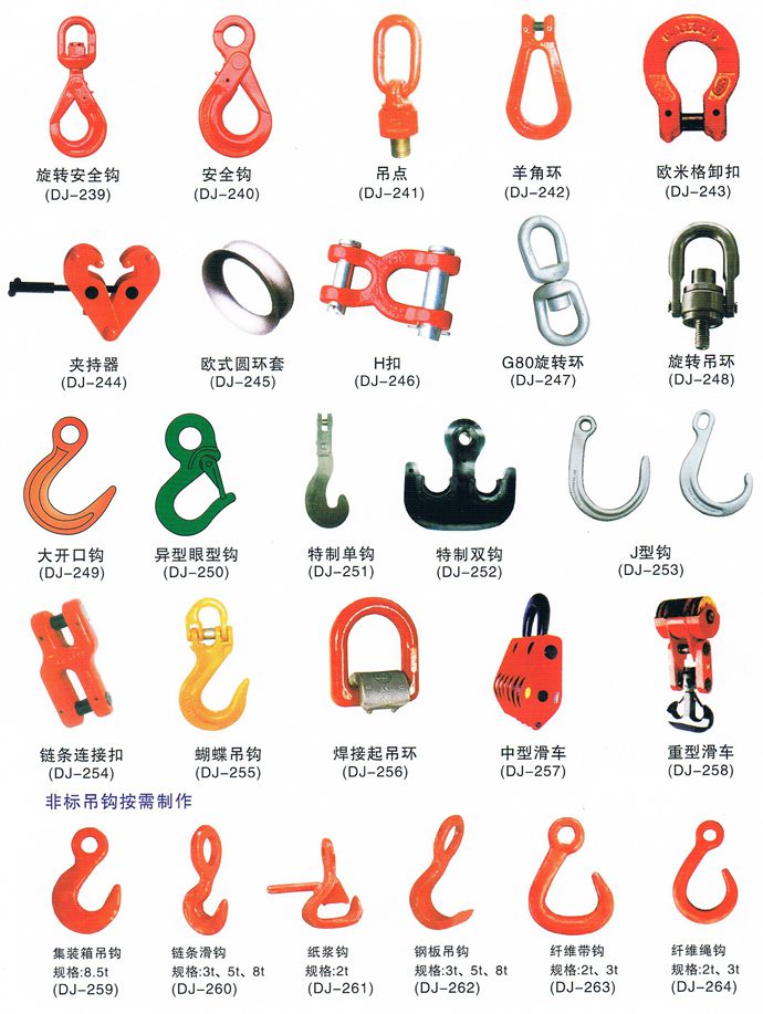 吊鉤主要有:旋轉(zhuǎn)吊鉤、美式貨鉤、眼型貨鉤、環(huán)眼貨鉤、S鉤、鼻形鉤、直柄吊鉤、羊角樺鉤、羊角抓鉤等。